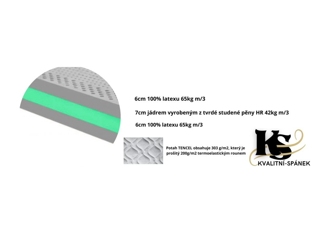 •6cm 100% latexu 65kg m/3 •7cm jádrem vyrobeným z tvrdé studené pěny HR 42kg m/3 •6cm 100% latexu 65kg m/3