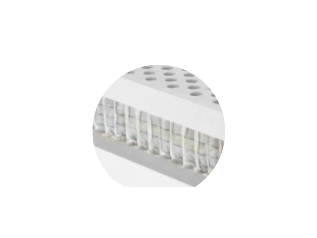 •   5 cm vysoký speciální perforovaný latex TALALAY 50 kg/m3 – měkčí strana   • 12 cm vysokým jádrem ze speciálních ortopedických taštičkových pružin cca 765 ks v rozměru 90x200 •   6 cm vysoká 3 zónová 100% latexová pěna 65 kg/m3 je perforována pro optimální větrání a odvod vlhkosti – tvrdší strana