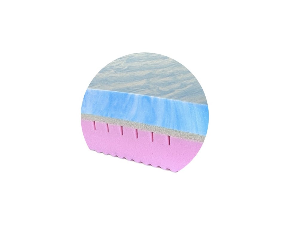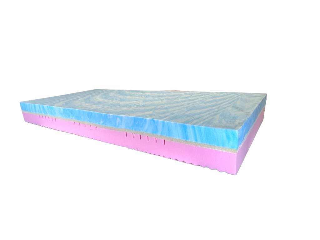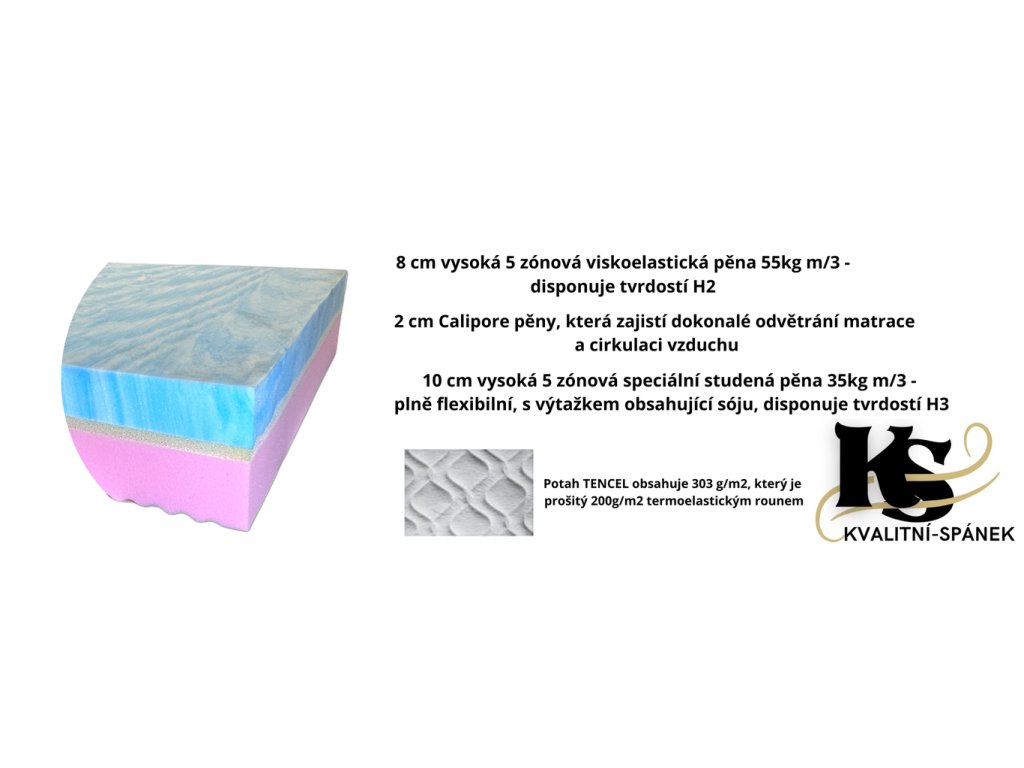 • 8 cm vysoká 5 zónová viskoelastická pěna 55kg m/3 -   disponuje tvrdostí H2, • 2 cm Calipore pěny, která zajistí dokonalé odvětrání matrace a cirkulaci vzduchu, • 10 cm vysoká 5 zónová speciální studená pěna 35kg m/3 - plně flexibilní, s výtažkem obsahující sóju, disponuje tvrdostí H3.